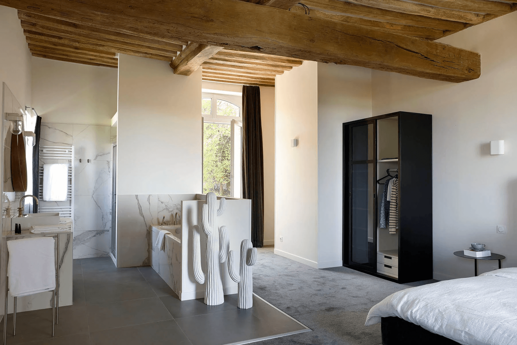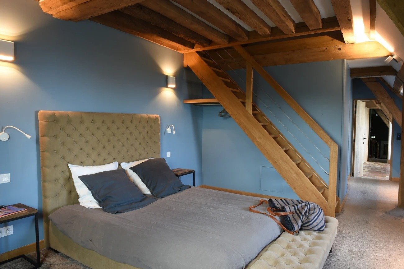 Située au deuxième étage sans ascenseur, Gratitude est une chambre de 30m2, vue parc, disposant d’un lit de 160cm. La salle de bain, avec douche et WC, est en mezzanine. On y accède par un escalier en pierre.