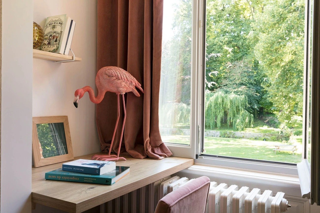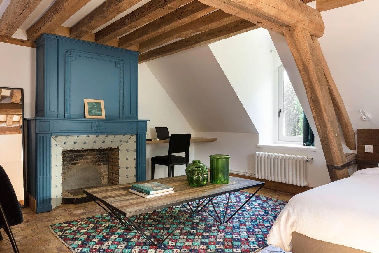 Située au deuxième étage sans ascenseur, Safran est une chambre de 43m2, vue parc, disposant d’un lit de 180cm, d’une salle de bain avec douche et WC.